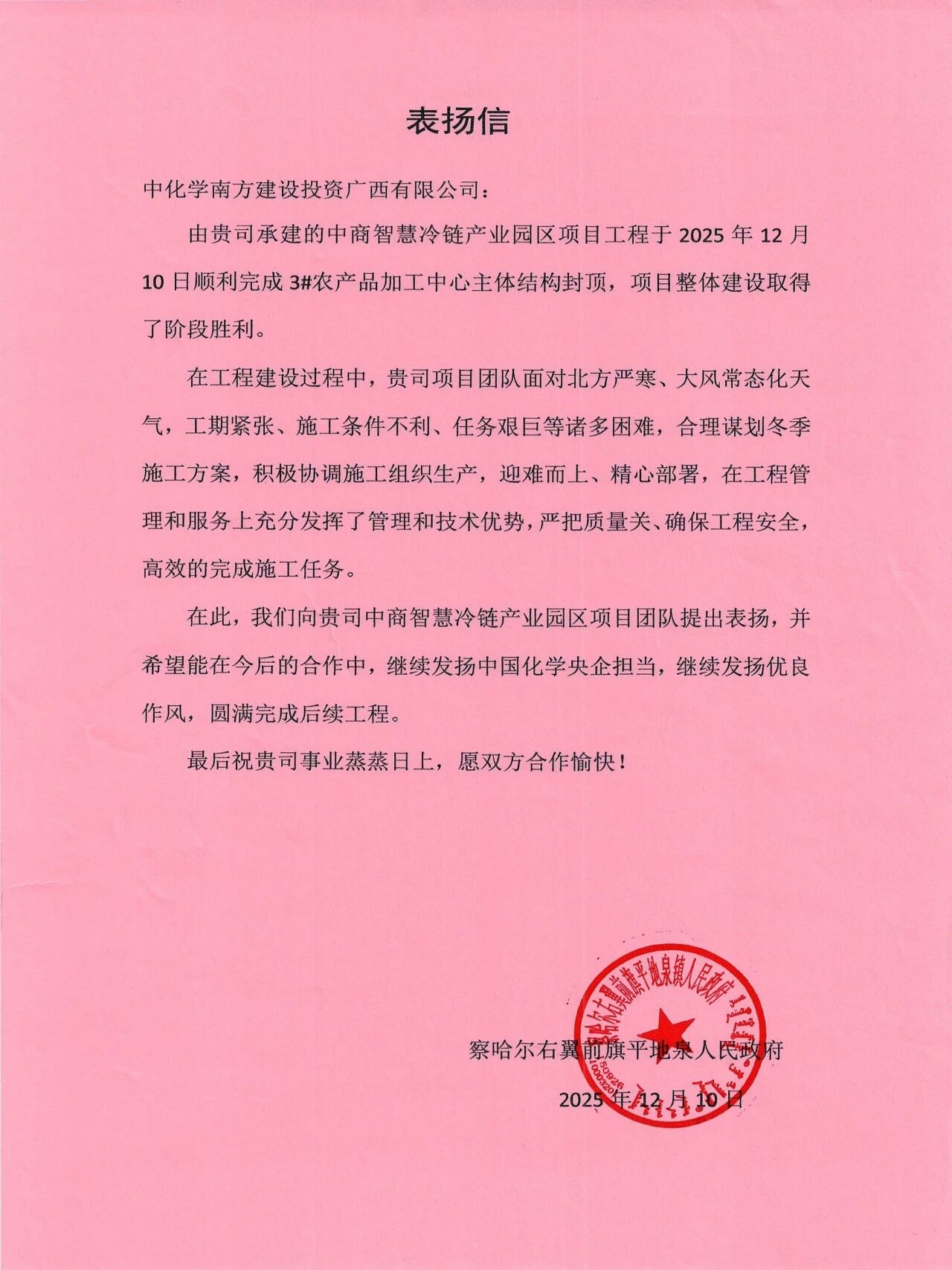 大干四季度 決勝收官戰(zhàn)|中商蒙北優(yōu)鮮智慧冷鏈產(chǎn)業(yè)園區(qū)項(xiàng)目收獲2封表?yè)P(yáng)信